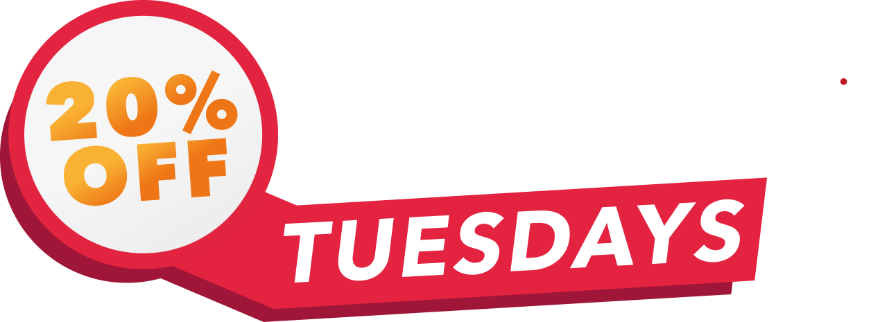 Get 20% OFF your entire bill on all takeaways or when dining in (excluding drinks) each and every Tuesday*.